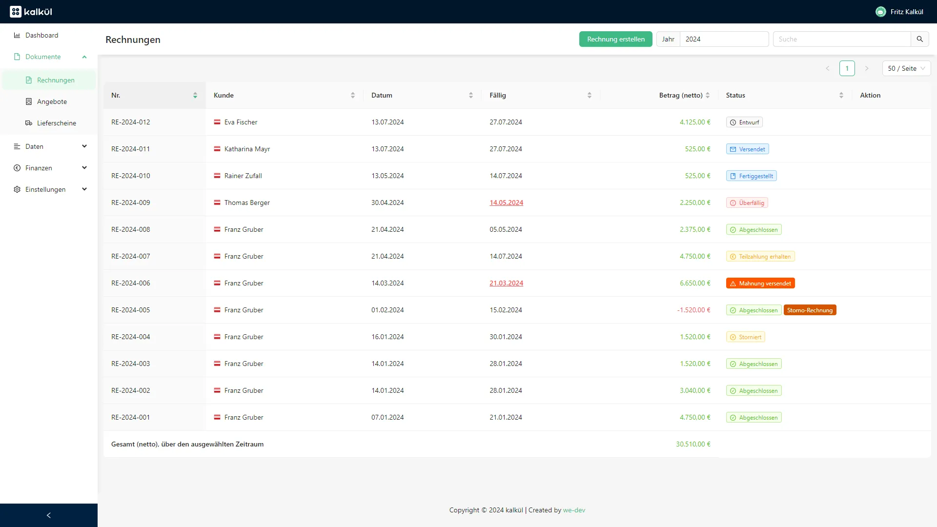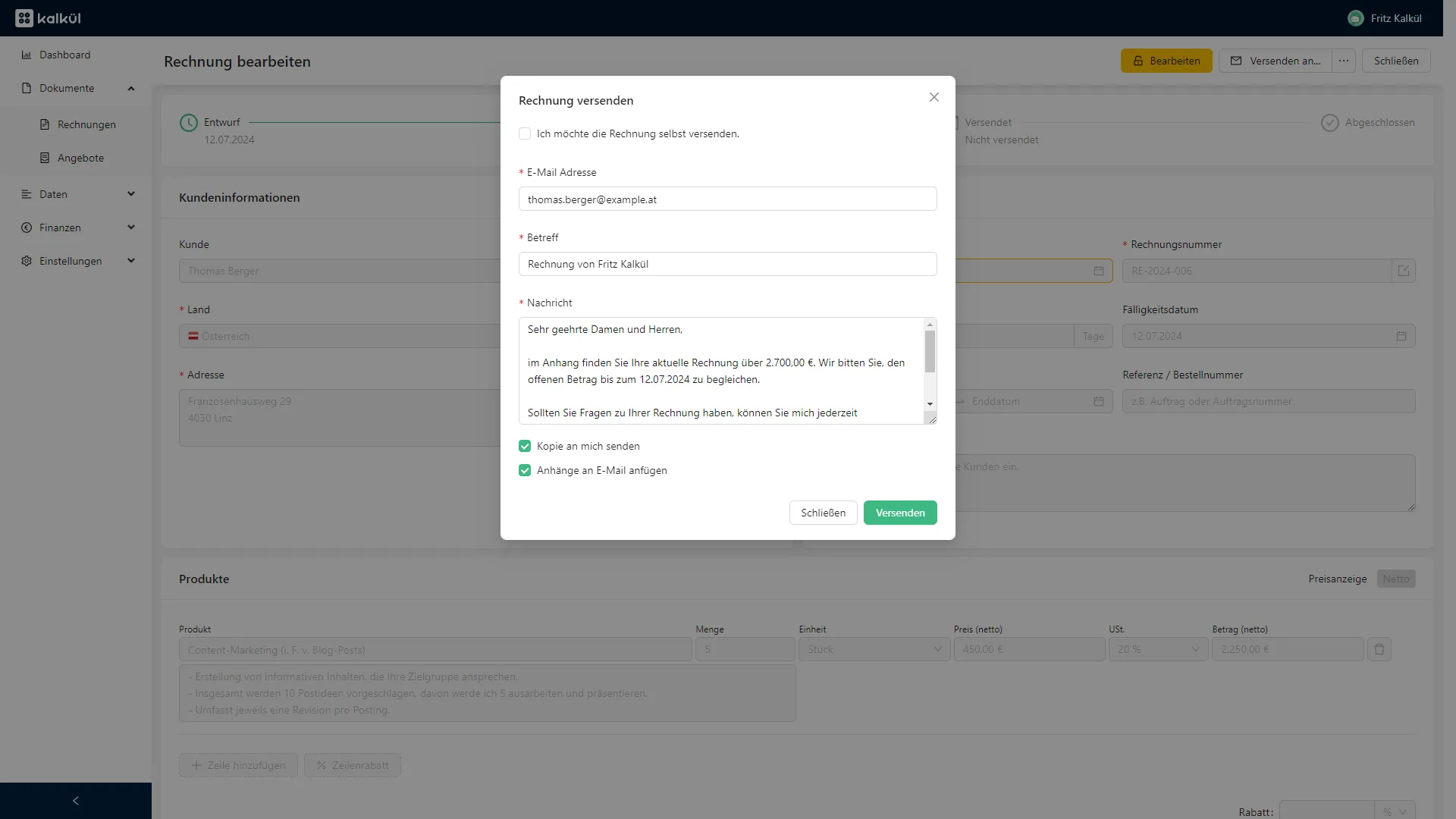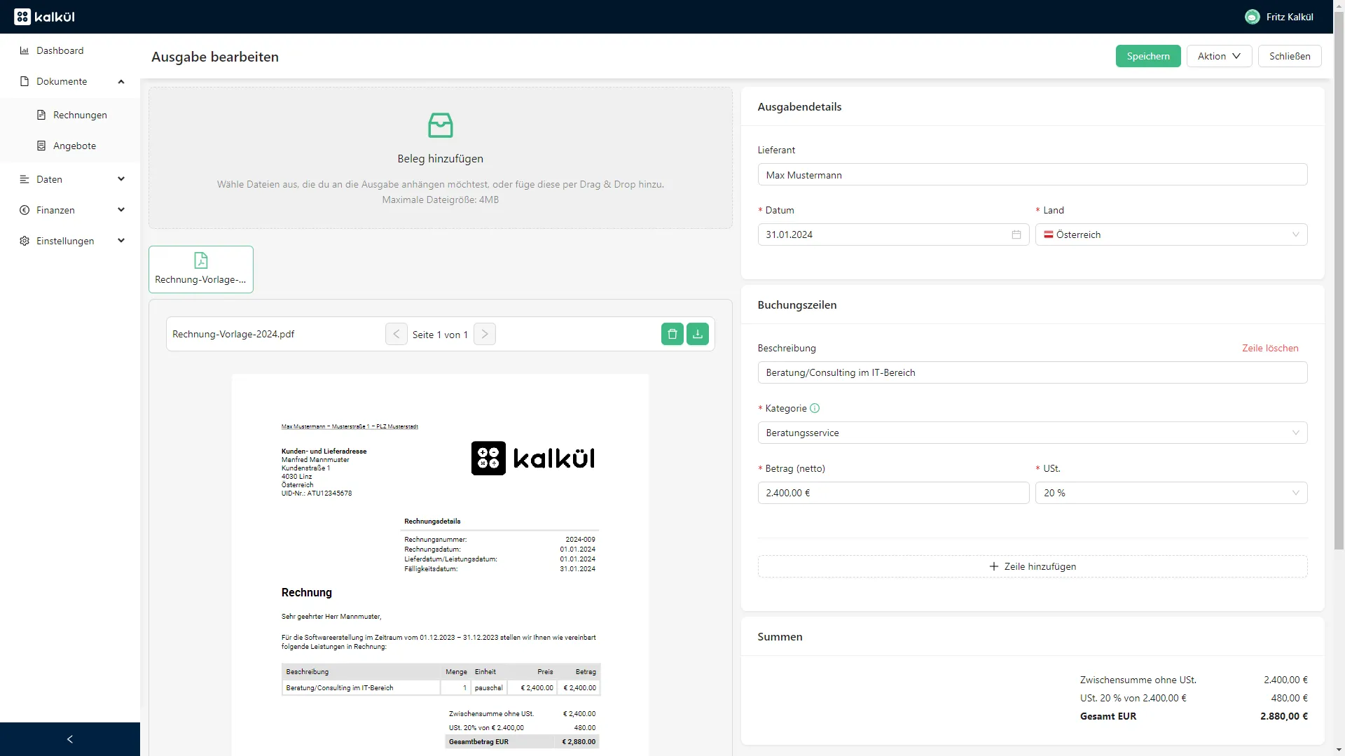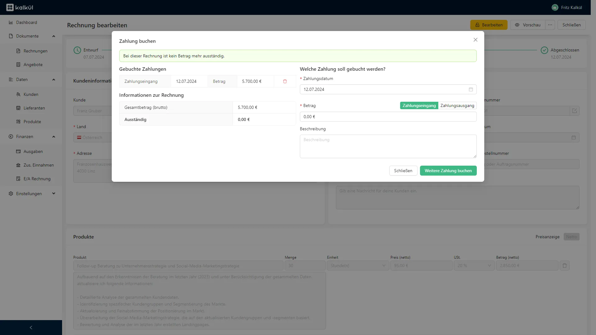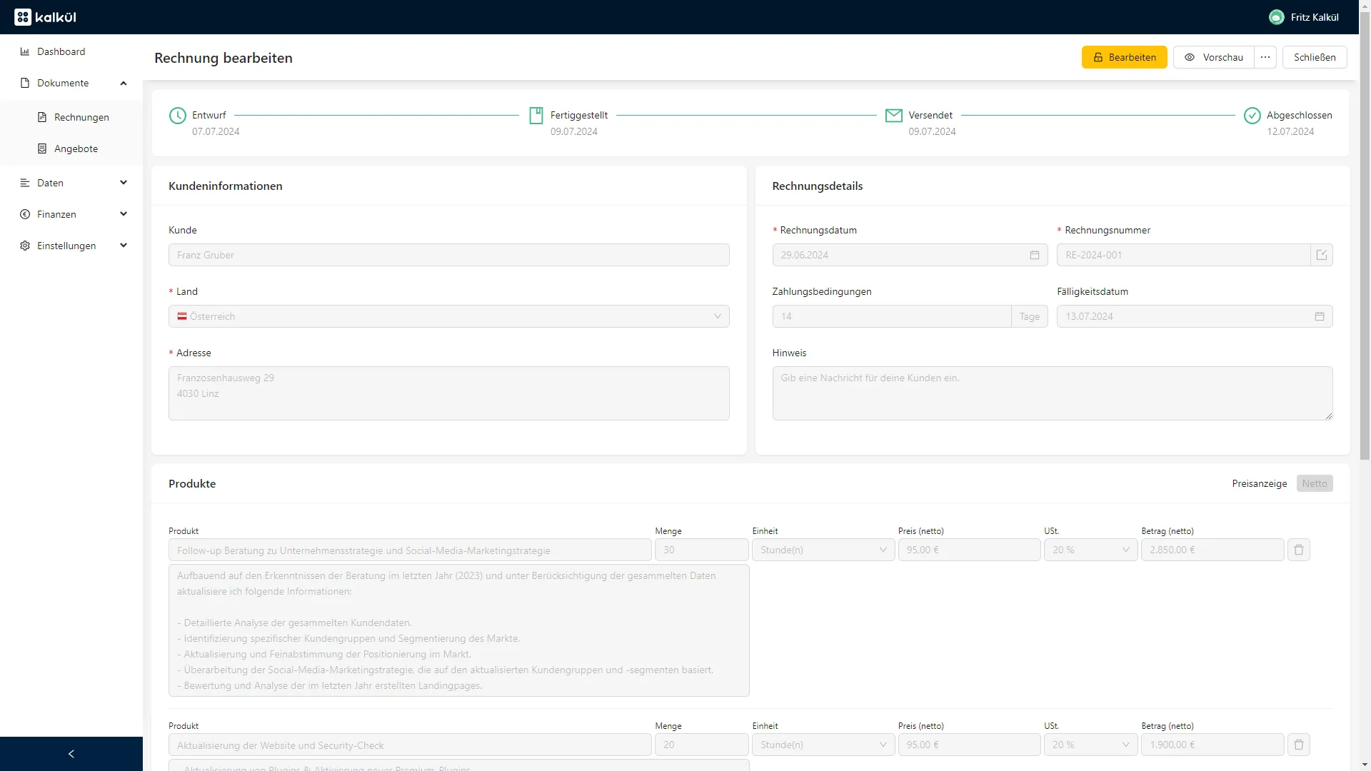 Kalkül ist eines der intuitivsten Rechnungsprogramme. Der Support ist grandios (sogar am Wochenende)! Bin voll und ganz zufrieden. Danke!