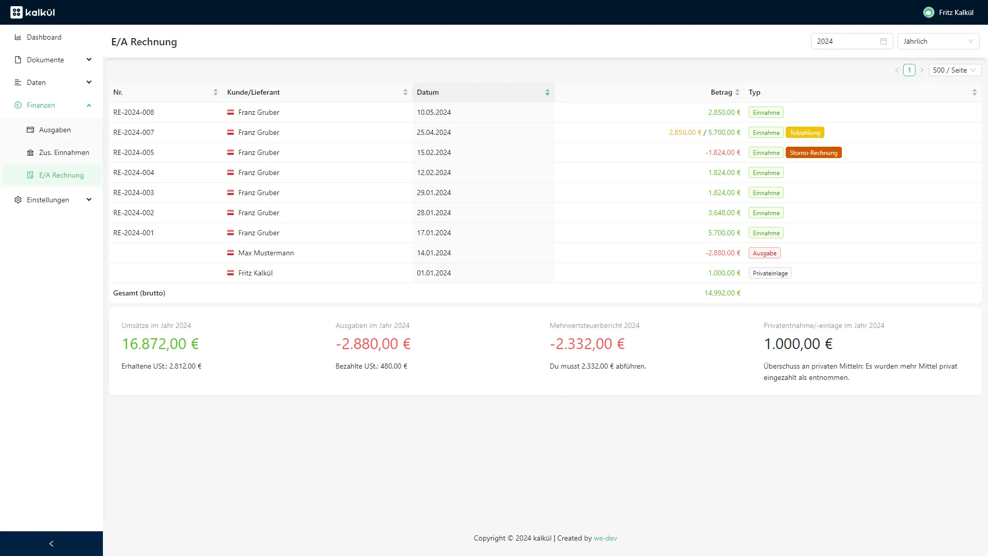 kalkül erstellt automatisch eine Einnahmen-Ausgaben Rechnung (Österreich) basierend auf den erstellten Rechnungen und hinzugefügten Ausgaben.