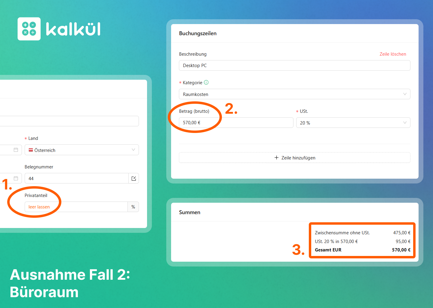 Öffne die Ausgabe und klicke auf „Weitere Details“. Trage im Feld Privatanteil 95 % ein und fülle anschließend die restlichen Felder wie gewohnt aus. Kalkül zieht den Privatanteil automatisch ab und zeigt ihn in der Zusammenfassung.