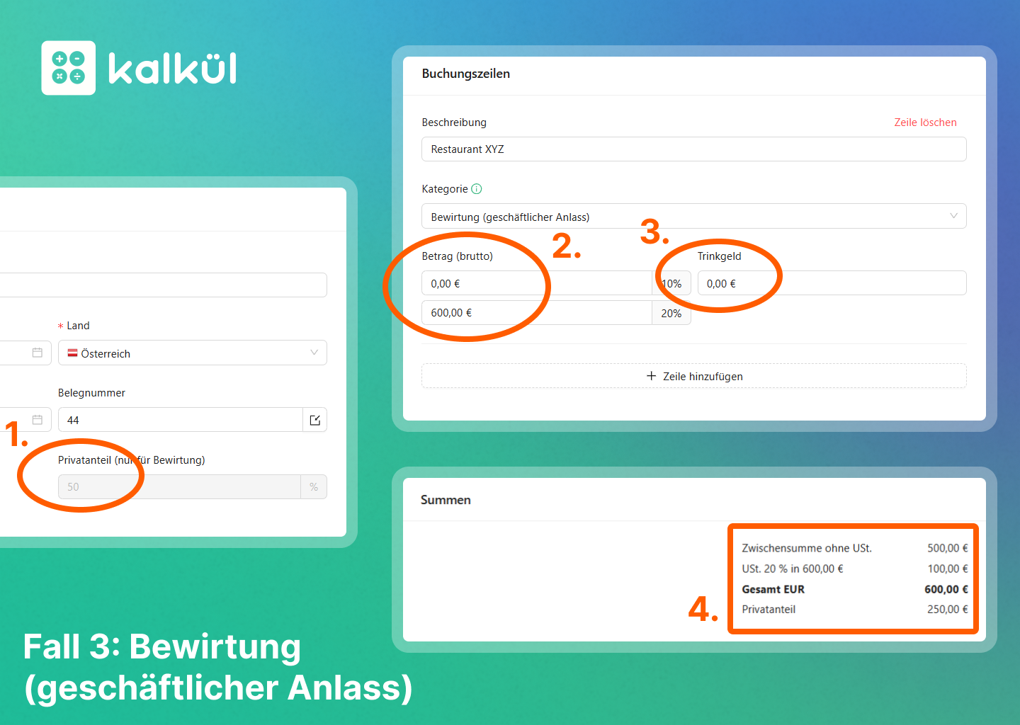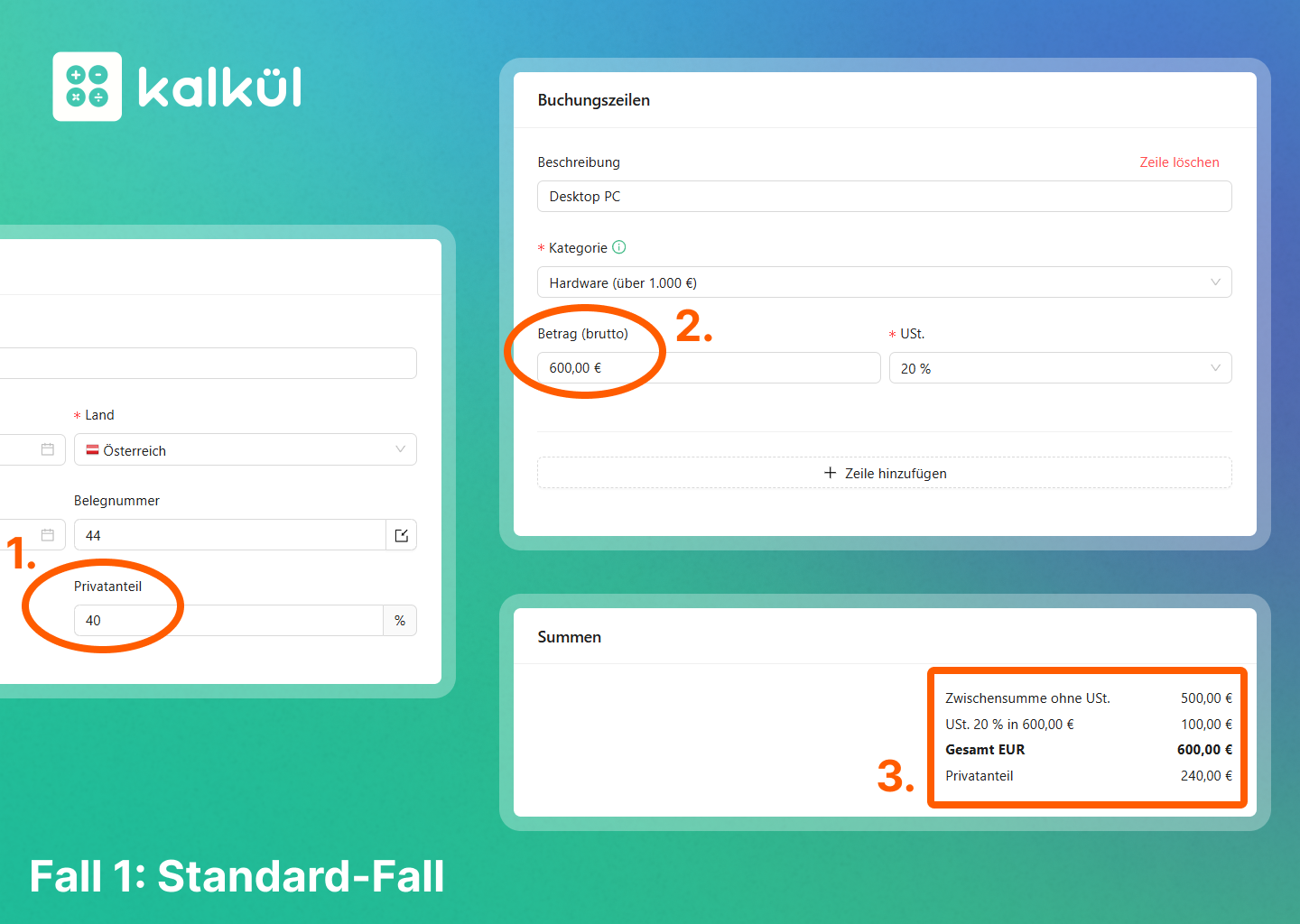 In diesem Guide zeigen wir, wie man den Privatanteil bei Ausgaben richtig erfasst. Die gute Nachricht: kalkül berechnet den Privatanteil in den meisten Fällen völlig automatisch.