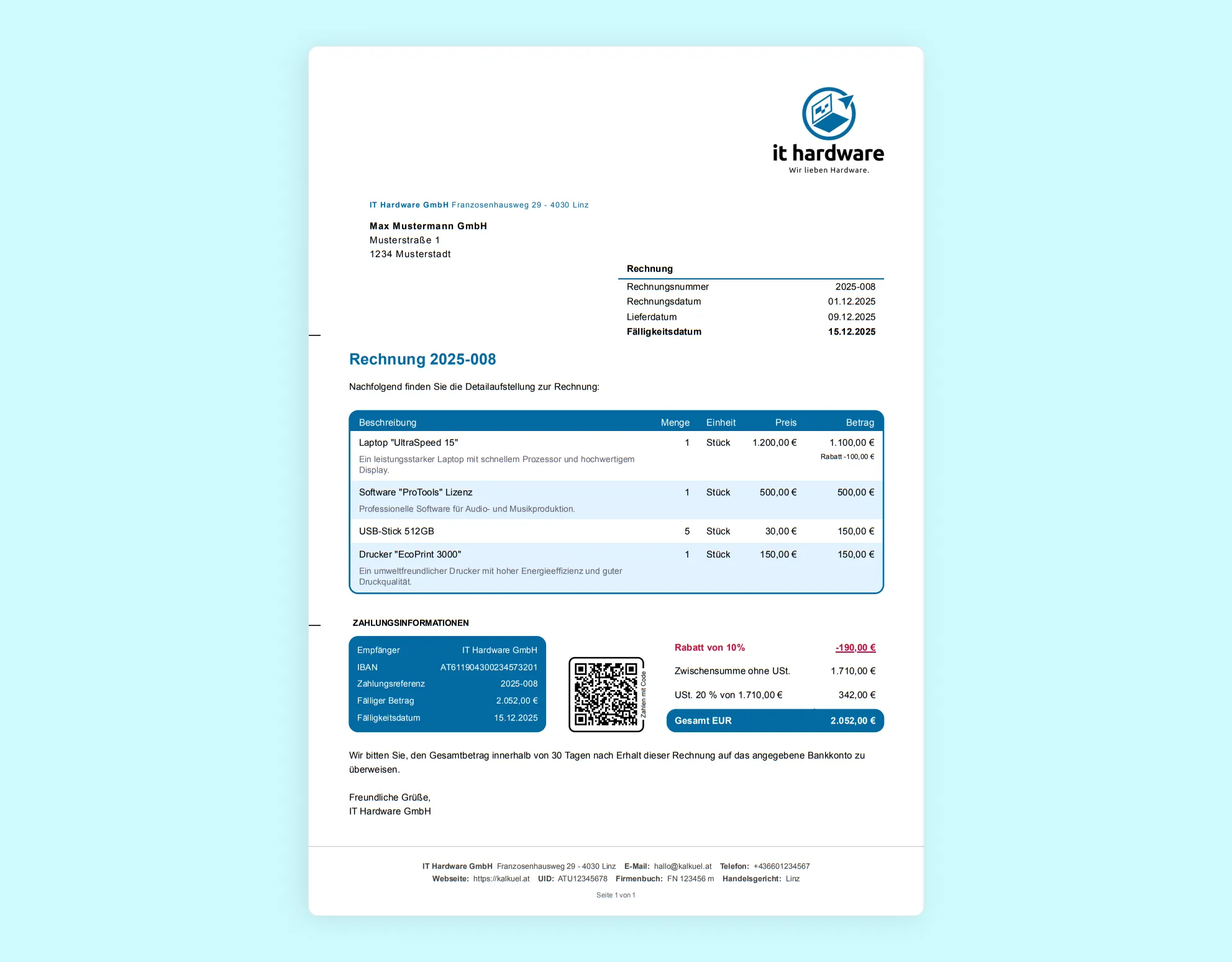 Füge auf Wunsch einen QR-Code zu deinen Rechnungen hinzu, der mit Banking-Apps zur schnellen Zahlung gescannt werden kann.
