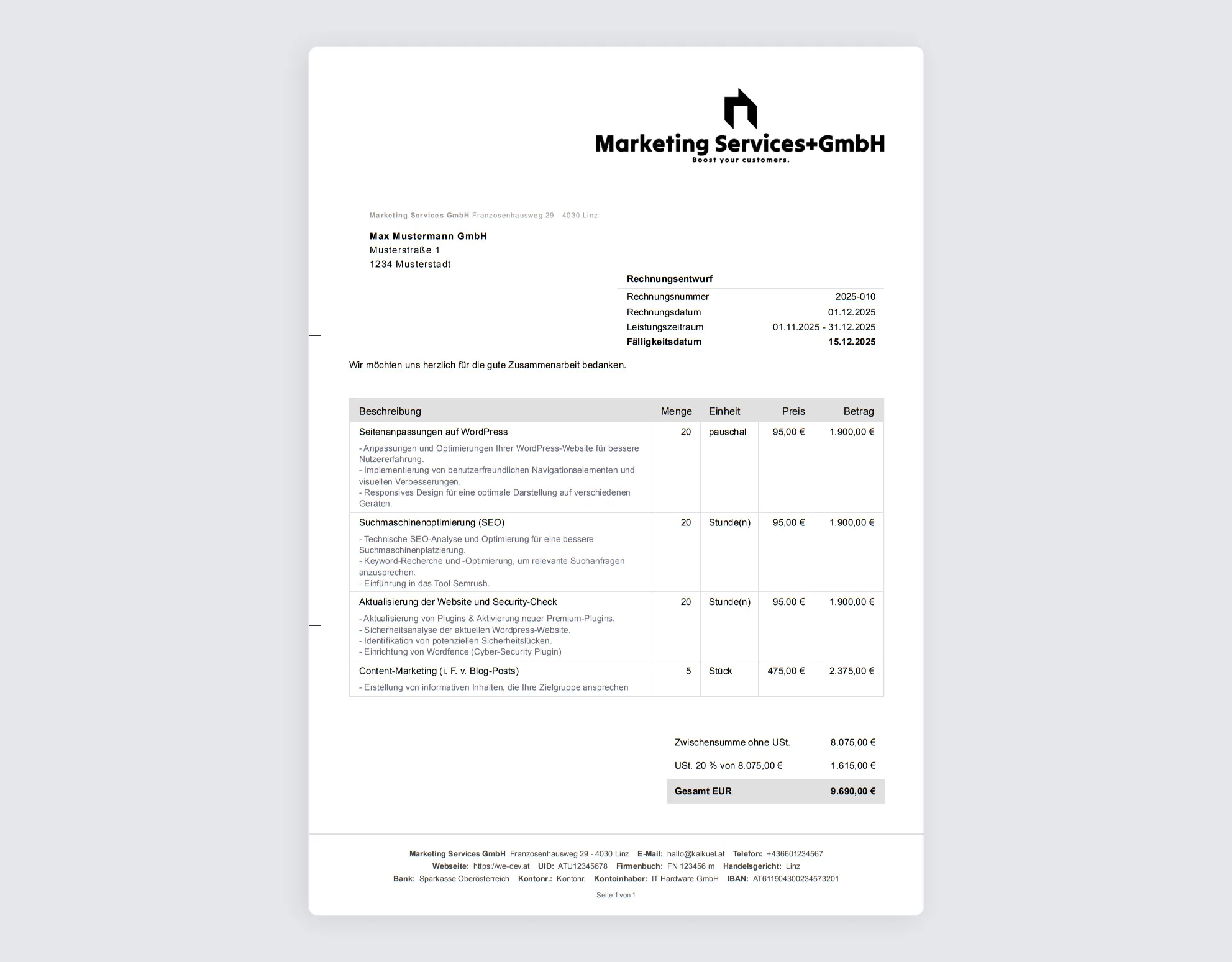 Entdecke, was unser Rechnungsdesigner möglich macht. Die Beispiele zeigen, wie einfach und flexibel du dein Design anpassen kannst – ganz nach deinen Wünschen und dem Stil deines Unternehmens.