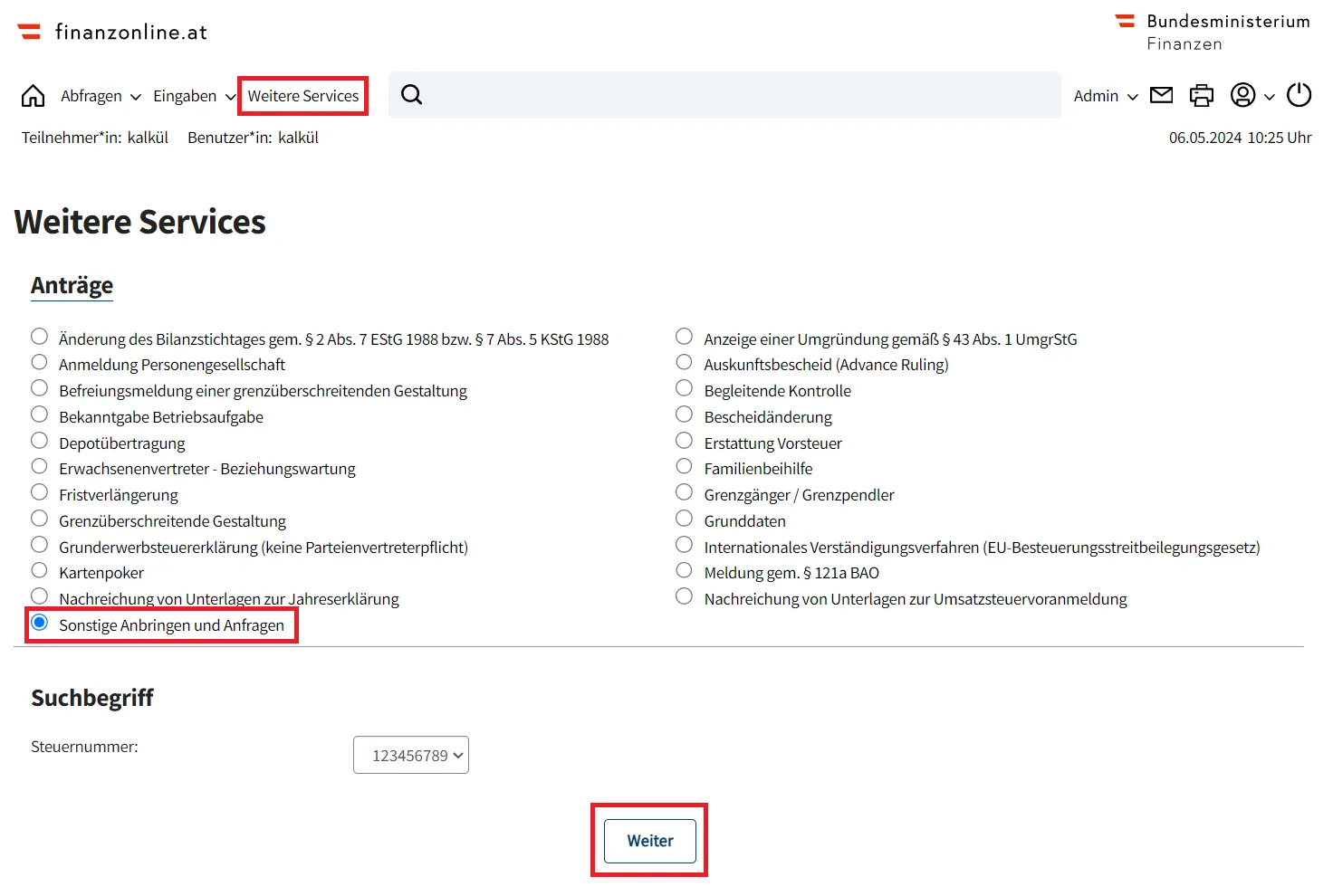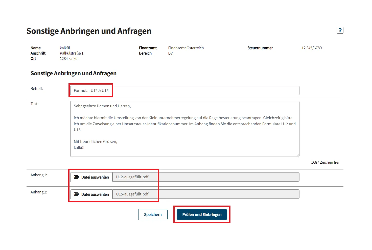 - Formular einreichen: Reichen Sie die beiden ausgefüllten Formulare U12 und U15 über das Finanz Online ein. Sie können die Schritte in den folgenden Bildern genau verfolgen.